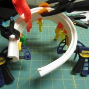 Once all parts are bent, you can proceed in assembling the necklace. To glue the styrene, I like to use Plasti Weld plastic cement. It will bond the styrene to the flexible plastic. Line the parts up and clamp them together. Then spread the cement along the joint and it will be drawn into the seam and fuse the plastic together. Since the pieces will not have exactly the same bend, you will need to work slowly and make sure everything lines up before you start. I like to have 10-15 spring clamps and clamp the entire tube in place and then glue the joint. You could try to glue in sections, but will need to be sure that the tube stays aligned so the beginning and end will both match up.